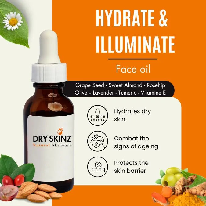 Soothe your dry skin with our nourishing facial oil: HYDRATE & ILLUMINATE. This rich formula, infused with Grape Seed Oil, Sweet Almond Oil, Rosa Canina Fruit Oil (Rosehip Oil), Olive Oil, Vitamin E, Turmeric Root Oil, and Chamomile Oil, hydrates, nourishes, and protects your skin. Promotes a healthy glow.